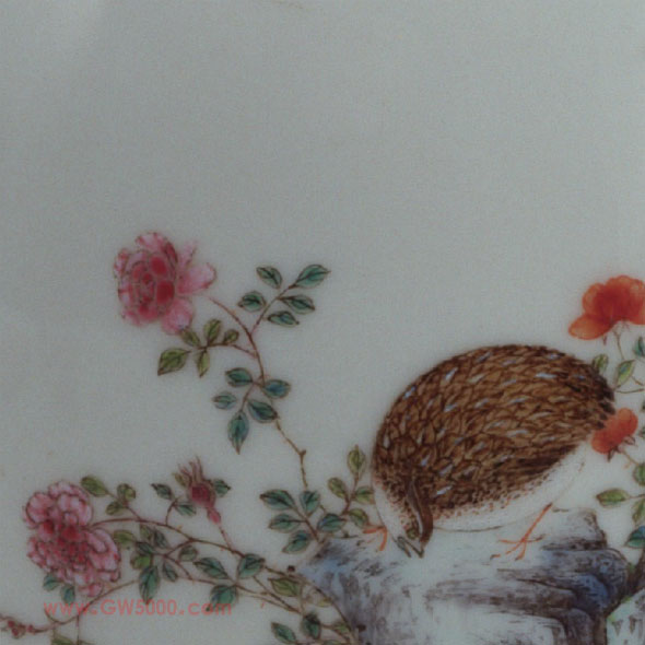 此瓶胎质莹白如雪,釉色光润柔和。器身用珐琅彩画鹌鹑,湖石,辅以翠竹、花卉等,寓意“安居乐业”。底有蓝料“乾隆年制”双行四字篆书款。造型端庄秀巧,图案温润柔丽,传世弥足珍贵。