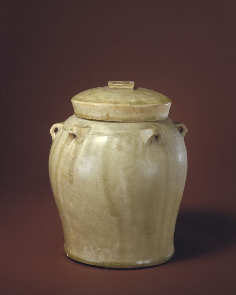罐盖直壁弧顶,盖顶置一方形纽,罐身直口,溜肩,弧腹,近底处渐收,通体施灰白色釉,器身流釉,肩部两道弦纹处设有两个横形系和四道竖形系。