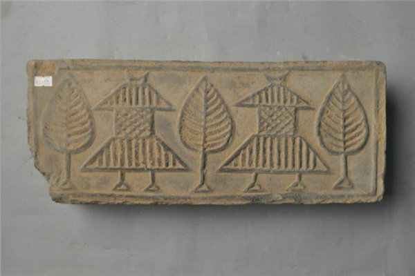 砖呈长方形,模制。画面左、中、右各有一长青树,树间分别置双层亭阙各一。图案简洁大方。