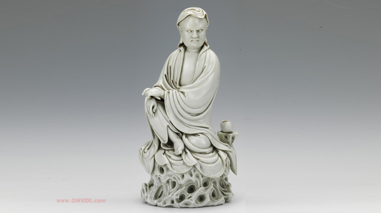 象牙白釉,滋润似玉。达摩双耳长垂,两眼凝视,双唇紧抿,表情庄严。前胸袒露,衣纹迭褶自然下垂,有临风飘逸的质感。背后钤方形“何朝宗印”,为嘉靖、万历间德化窑瓷塑名家何朝宗的作品。