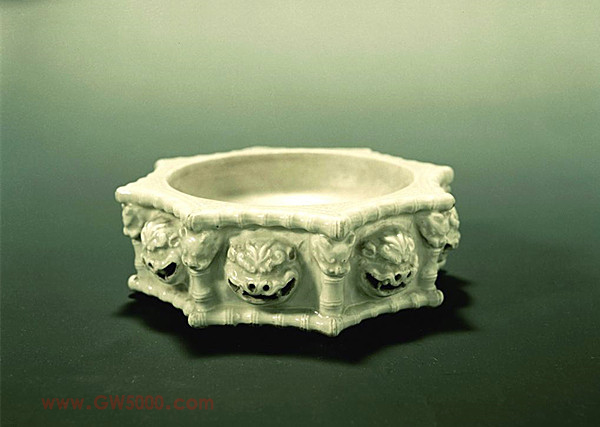 大体呈八角形,上沿印有珍珠地纹饰,腹部装饰八个衔铃兽首,并用兽首和竹节间隔,摇之作响,也有人称之为祭盘。通体施白釉,底端露胎。釉色稍泛灰,但光润莹亮。此盘造型别致,釉质细腻,采用刻、印、雕等多种技法综合而成,做工精细,布局对称,主题突出,为宋代定窑珍品。