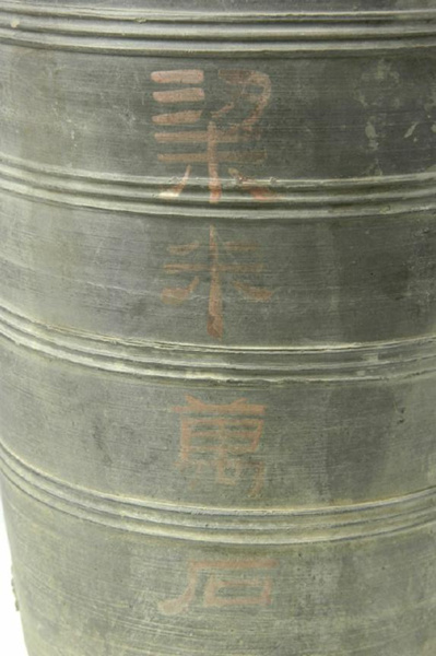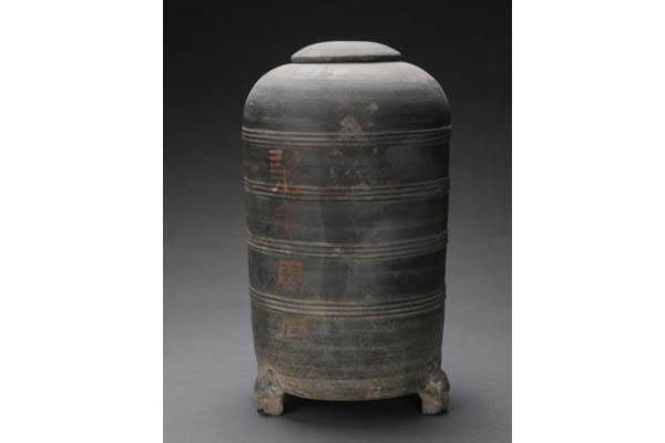 圆柱体,直口,平沿,圆肩,柱状腹,平底附三蹲熊足。口上承覆钵式盖,通体饰四组凸弦纹。腹侧有朱彩隶书“梁米万石”4字。
