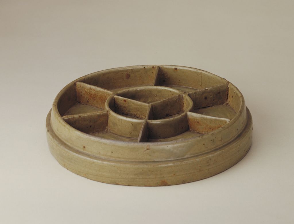 槅(gé 音格)呈圆形,直口,平底。底有红色支烧痕。内分九格,其中中心三等分,外周六等分。通体施青釉。