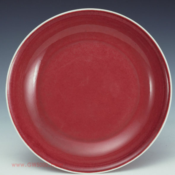 上海博物馆此器为标准官窑款,底部白釉闪牙黄色,盘内外施红釉,釉汁肥厚莹润,闪现红宝石般的光泽,细看呈细丝纹,口部因流釉形成“灯草边”。此类高温铜红釉又被称为“宝石红”,是以铜为呈色剂,在高温下一次烧成,由于其烧造要求很高,成品率低,在当时就较为珍贵。永乐、宣德的红釉更是以其釉色深沉肃穆,蕴含宝石般光泽,为世人所称道。这件器物与景德镇珠山出土的宣德官窑红釉盘式样类同,是典型的宣德器。