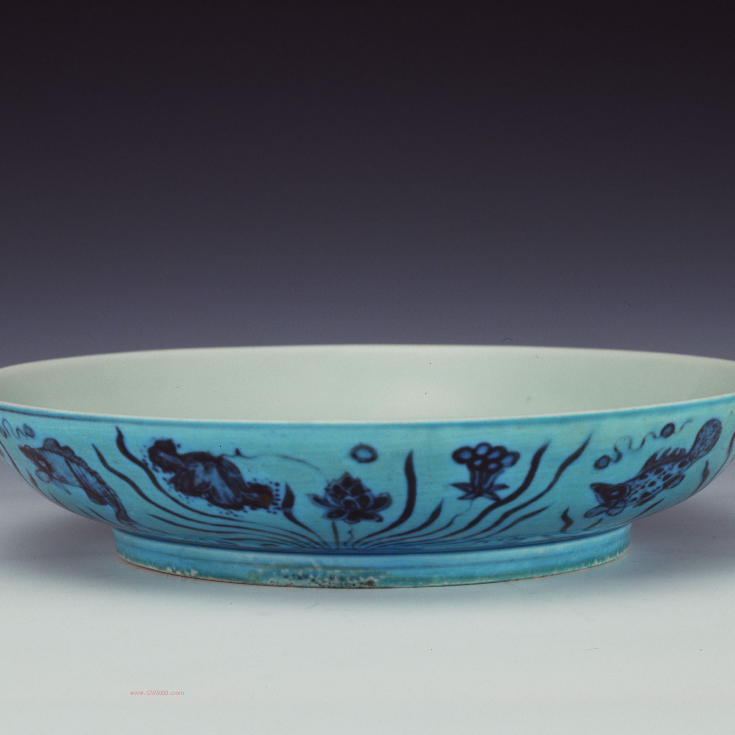 相比于永乐、宣德青花的厚重沉稳,成化时期青花所用青料以国产“平等青”取代了从西亚进口的“苏麻离青”,青花趋于柔和淡雅,清新脱俗。“淡妆浓抹总相宜”,两种青花瓷代表了不同时代的审美趣味。这件鱼藻纹盘是成化官窑的精心之作,用青料绘制鱼藻纹饰,通体遍施孔雀绿釉,入窑再次焙烧。此时的青花呈现出馥郁的黑蓝色,翡翠色的湖水中,鱼类与水生植物产生了一种神奇的立体感。古人运用色彩的功力,可见一斑。