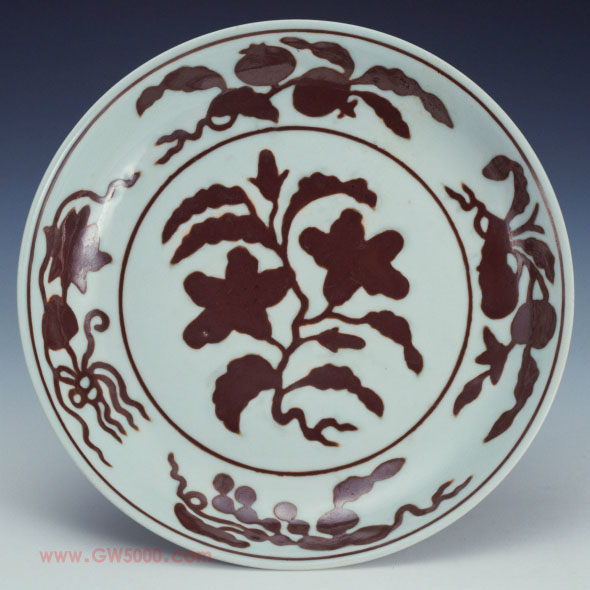 这是一件标准的官窑盘,底部有青花双圈“大明弘治年制”楷书款,堪为此期器物的标准器。盘内的装饰图案亦为弘治官窑器的流行式样,但采用在施以底釉的坯体上剔去花纹部分的釉层,再填绘酱色釉的“刻填”手法,则是比较罕见,为不可多得之珍品。