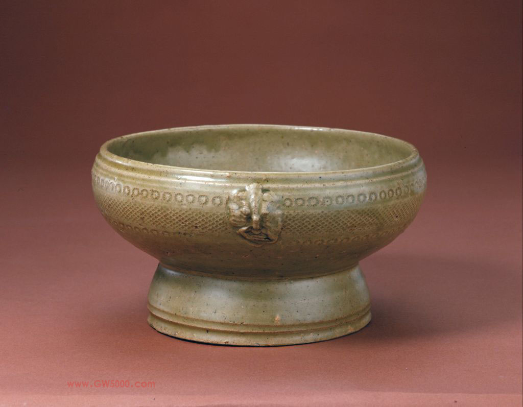 青釉印纹豆,高9.3厘米,口径16.8厘米,足径11.9厘米。