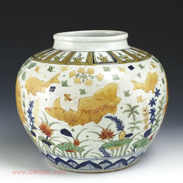 嘉靖一朝,对鱼藻纹颇为偏爱,据嘉靖本《江西省大志∙陶书》记载,嘉靖二十一年曾烧造“青花白地满池娇鲭鲌鲤鳜水藻鱼罐二百”,传世品中见有此类青花及青花矾红彩品种。如本品之五彩鱼藻纹大罐,则传世数量不多,故弥足珍贵。