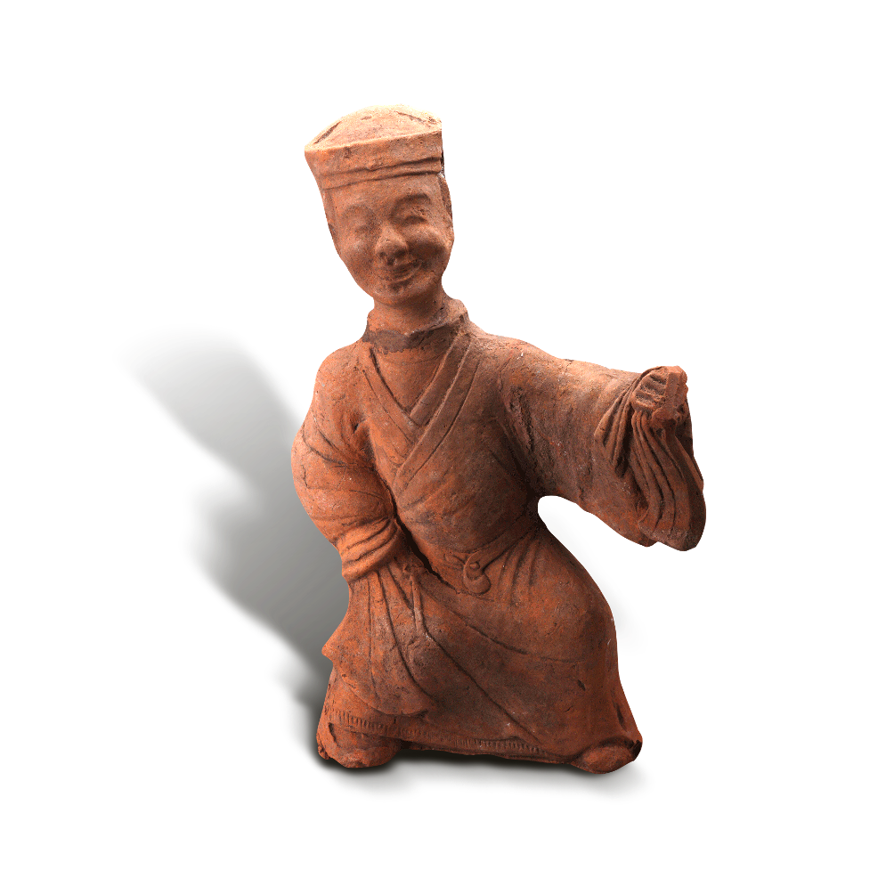 头上着帻身着宽袖长袍腰间束带带钩横穿于腰际右腰侧悬挂环柄小刀双手各执长巾左手平举右手叉腰脸方圆面微笑。