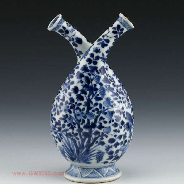 这是一件造型独特的外销瓷,双口联体,器腹隔断不通,可同时盛放两种液体,其出现可能与十六世纪一种意大利的油醋罐有关系。这件器物是典型的订烧作品。明末清初,外销瓷贸易兴盛,出现了很多来样加工的器物,尤以餐饮器为多,这件器物可能就是为荷兰市场特别烧制的。