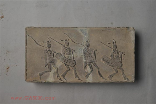 长方形砖,正面模印武士图案。武士一行四人。一、三两人右手执盾,左肩荷剑;二、四两人负箭扛弓。四人皆顶巾束发,身着褶衣缚裤,作疾行状。