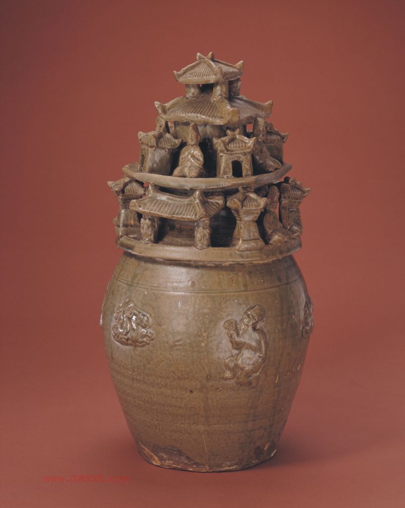 谷仓罐流行于三国(吴)、西晋时期,有陶、瓷制品,是由东汉的五联罐演变而来,是当时的随葬用品。其雕塑复杂,楼阁、飞禽、动物、乐舞杂技是其主要表现内容,着重表现豪门贵族生前居住的城堡式楼阁建筑以及奢华的生活场面。瓷器釉色名。一种含铁量在1%—3%左右,经高温还原气氛中烧成,呈现青绿色泽的釉,是中国最早的颜色釉。商周时期原始瓷器的青黄釉色是青釉的初级阶段。汉代已烧制出釉色纯正的青釉瓷器。至唐代日臻完美,被誉为“千峰翠色”。宋代的粉青、梅子青如同青玉,色泽与质感之美达到顶峰。明清之际,永乐朝的翠青、冬青(即东青),雍正朝的粉青、豆青等均色调匀净,苍翠欲滴,烧制水平已臻于炉火纯青的境界,出现了很多名贵品种。