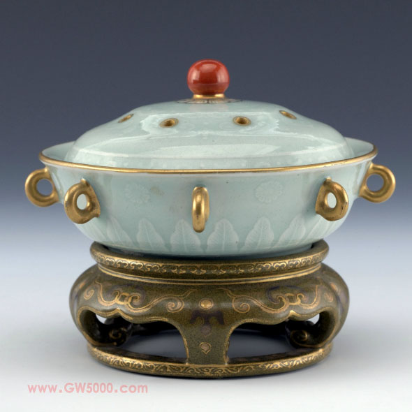 冬青釉指色泽稍淡、青中略泛绿或蓝的釉色。描金是以金粉或金水描绘瓷器纹饰的装饰方法,使之金碧辉煌、富丽华贵,为富贵人家所喜爱。瓷器烧成后可用玛瑙棒或石砂摩擦,以增加器表光泽度。底座以茶叶末釉模仿铜器外观,也是当时风尚之一。