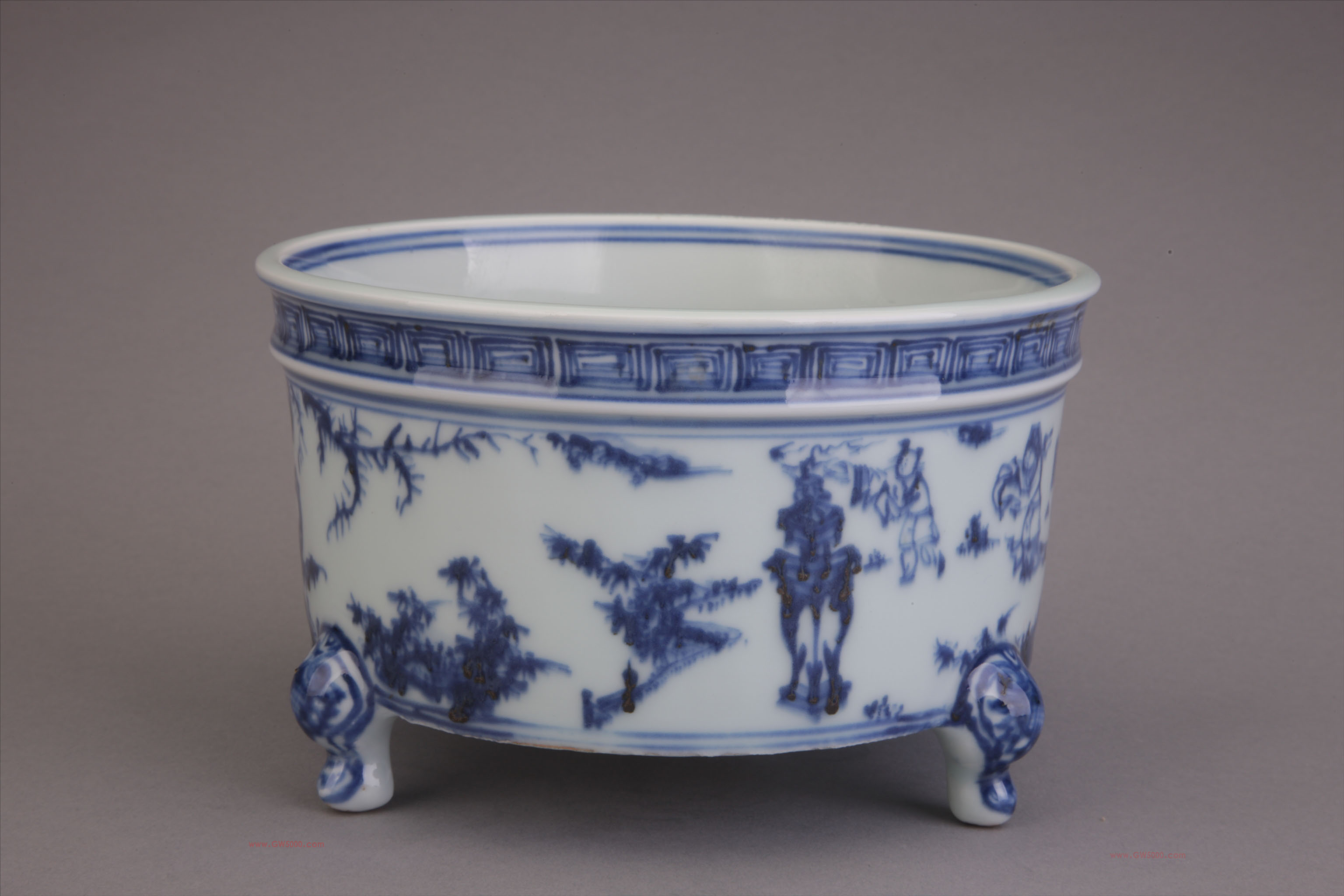 炉桶形广口口沿下内凹填青花回纹一周腹部绘松竹人物图笔法简洁粗犷青花色泽蓝中泛灰青釉水润泽。图绘主人在香炉前虔诚跪拜二侍从其后另一随从正在进香人物神态各异线条遒劲有力。炉为白瓷胎修胎精致平整釉肥色正三只兽头足极其饱满接口完全被釉料所覆盖。这件香炉应是大户人家祭祀用的礼器为明代中期的精美之作。