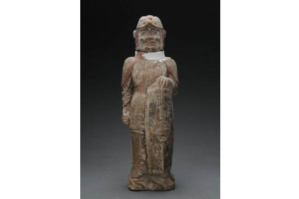 此俑头带盔,身穿甲,腰系带,下着缚裤,足蹬靴。左手持虎首盾牌,右手下垂作握手状,面带微笑站立于马蹄形板座上。甲服绘有朱彩及黑彩鳞片。形神兼备,制作精细,是研究北朝武士衣着装束的形象资料。