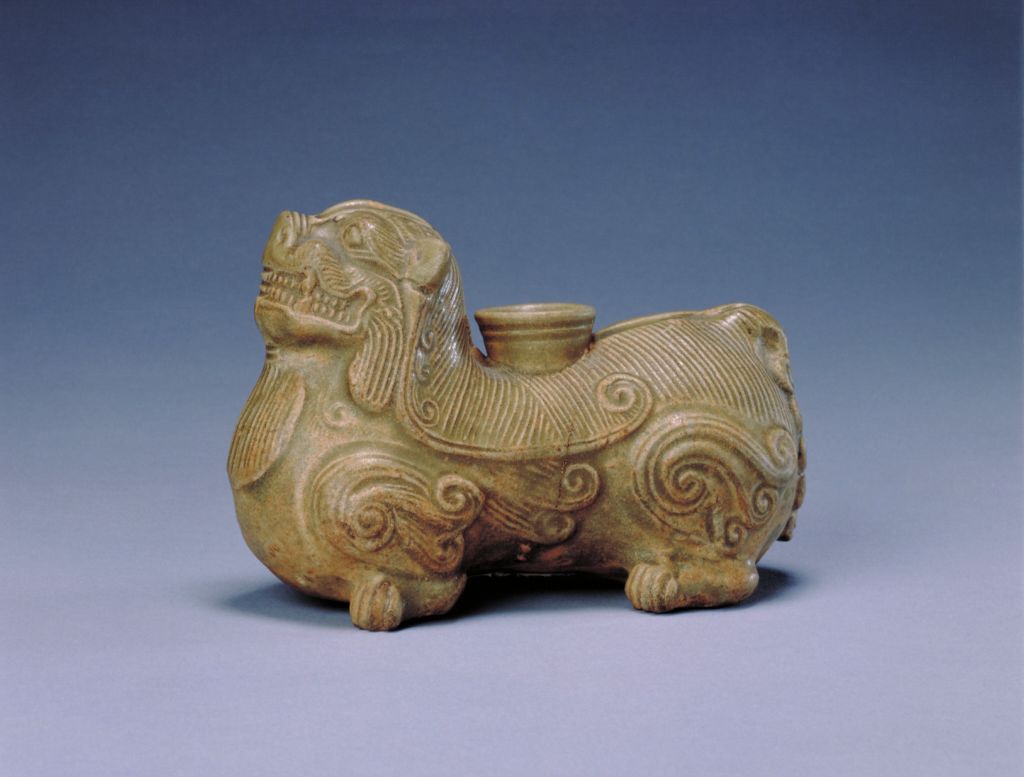 器型为卧狮形,昂首挺胸,双耳立起,背部安装一圆桶形插管。灰白色胎,通体施青釉。采用捏塑、模贴与细密线条刻划结合,形象生动,是集实用与玩赏为一体的艺术珍品。