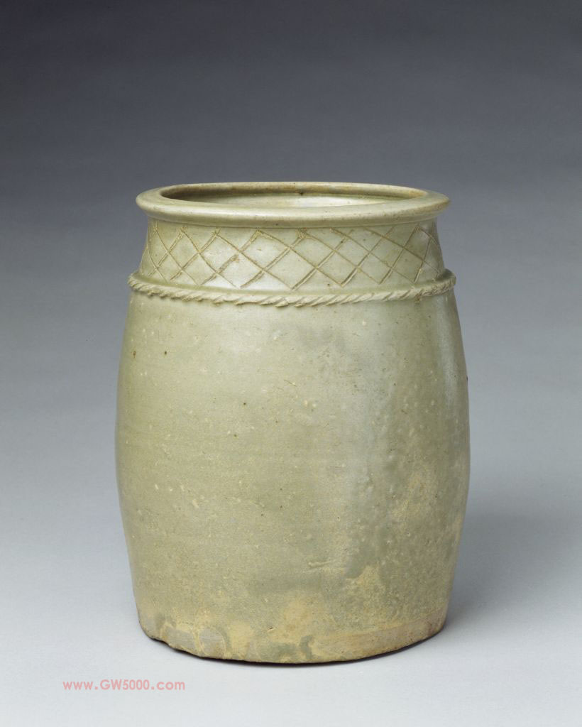 尊椭圆口,平沿,深腹,平底,胎灰色,施青釉,施釉不均匀,颈部刻网格纹,下方饰一周绳索纹。