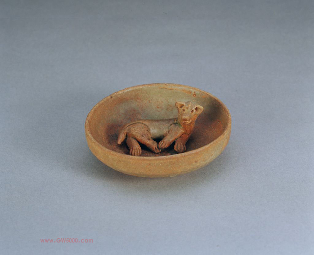 狗圈敞口,浅壁,平底微内凹。圈内塑一狗侧卧,脊背及爪印清晰,造型极为生动。胎质坚硬,釉色青中泛绿。