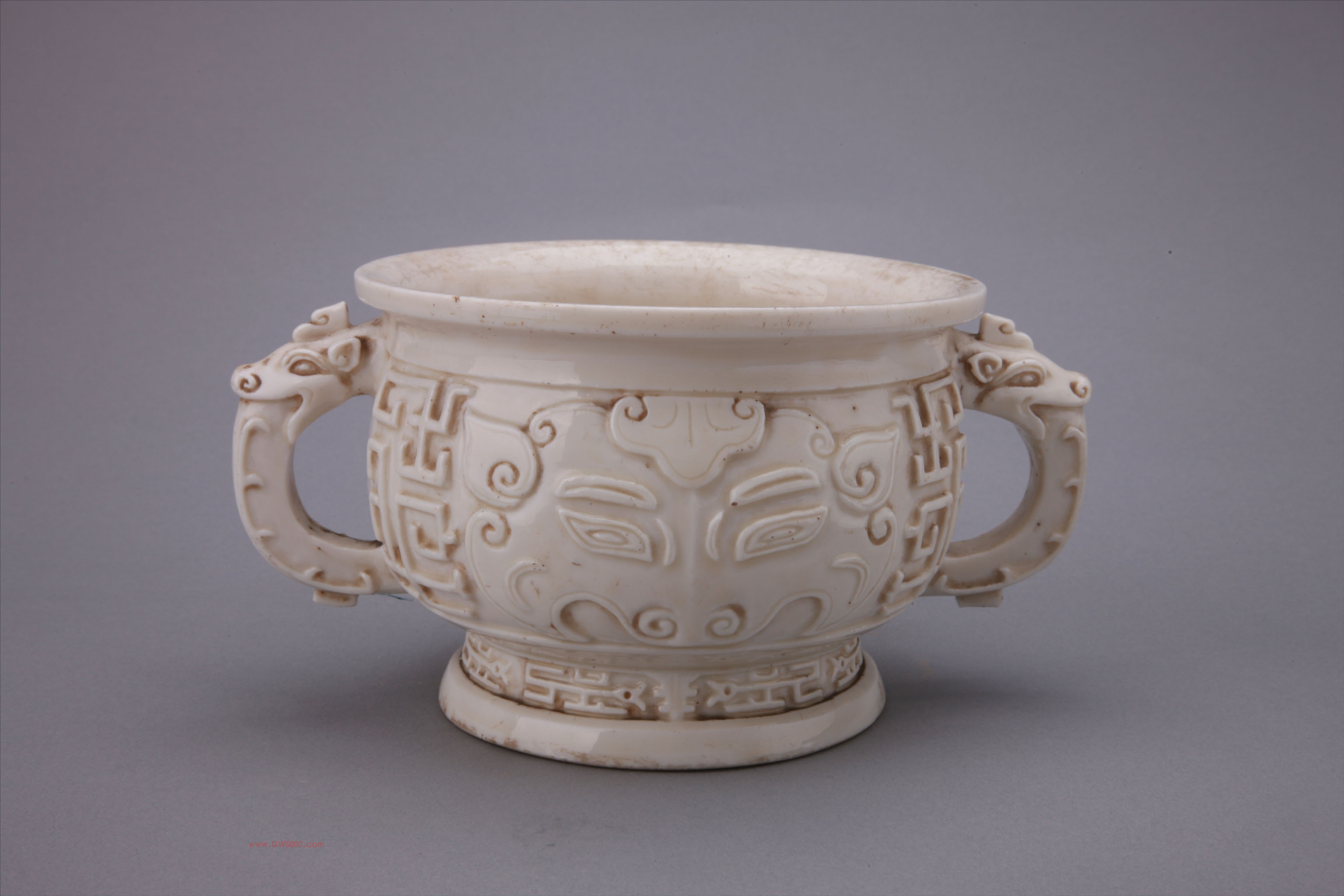 白瓷胎白釉略泛红釉汁细腻匀净胎体厚薄适度炉体两侧对称双兽耳炉腹主体为饕餮纹近外撇圈足一圈似为变体鸟纹炉口沿外翻圈足较深通体有牛毛纹。