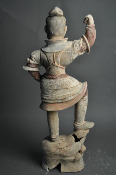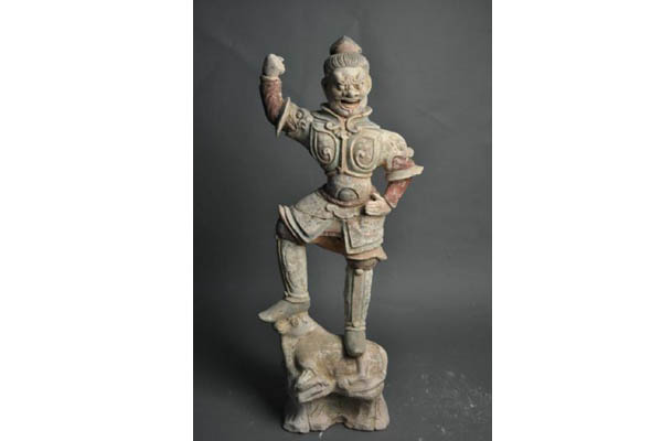 此俑头挽发髻,两眼外凸,怒视前方,张口露齿。身穿铠甲,胸口有护心镜,肩部铠甲呈兽首状。左手叉腰,右手握拳执兵器,足下踏一牛。通身饰红、黑彩。