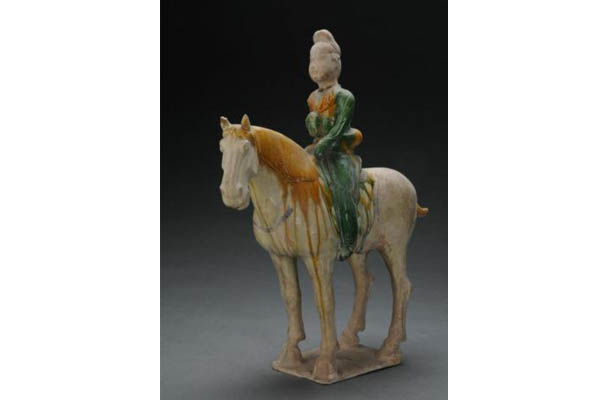 马立于长方形托板上。背上置障泥、鞍鞯。骑俑头戴双瓣幞头,上身着窄袖长袍,足蹬靴,两手握于胸前,似执缰揽辔。马身饰白釉,颈、鬃、尾施黄釉。俑袍领施黄釉,其他部分施绿釉。