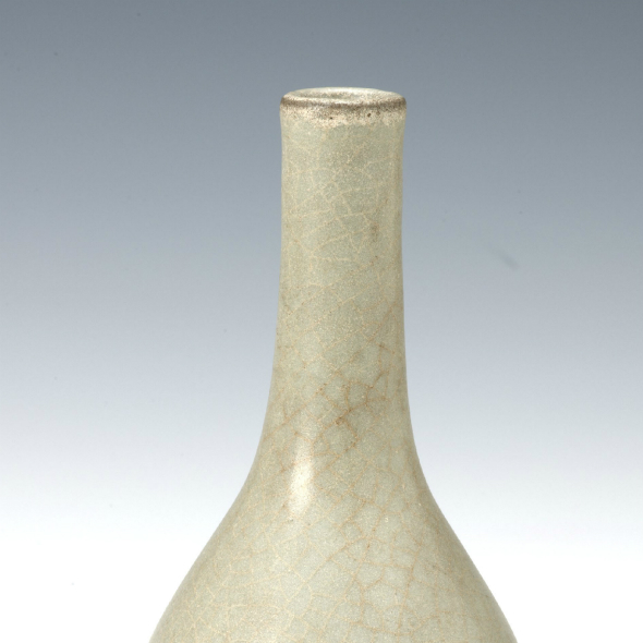 该器为典型的胆瓶造型。通体施青灰乳浊釉,釉层较厚,釉面乳浊失透,开片细密,纵横交错,口沿釉薄处和圈足无釉处显现官窑瓷器特有的紫口铁足特征,造型典雅稳重。