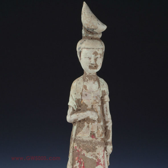 此俑胎质较细,洁白坚硬,模制而成。原有发为黑色,衣裙为红色,局部还有金彩,现已部分脱落。女俑头挽半翻髻,面容姣好,双目低垂,樱唇微起,若有所思。上穿宽领短袖衣,下着长裙,足穿云头鞋,亭亭玉立。宽宽的帔帛披于双肩,绕过两臂,垂而过膝,整体着装与唐永泰公主墓壁画中一位人物相似,楚楚动人。