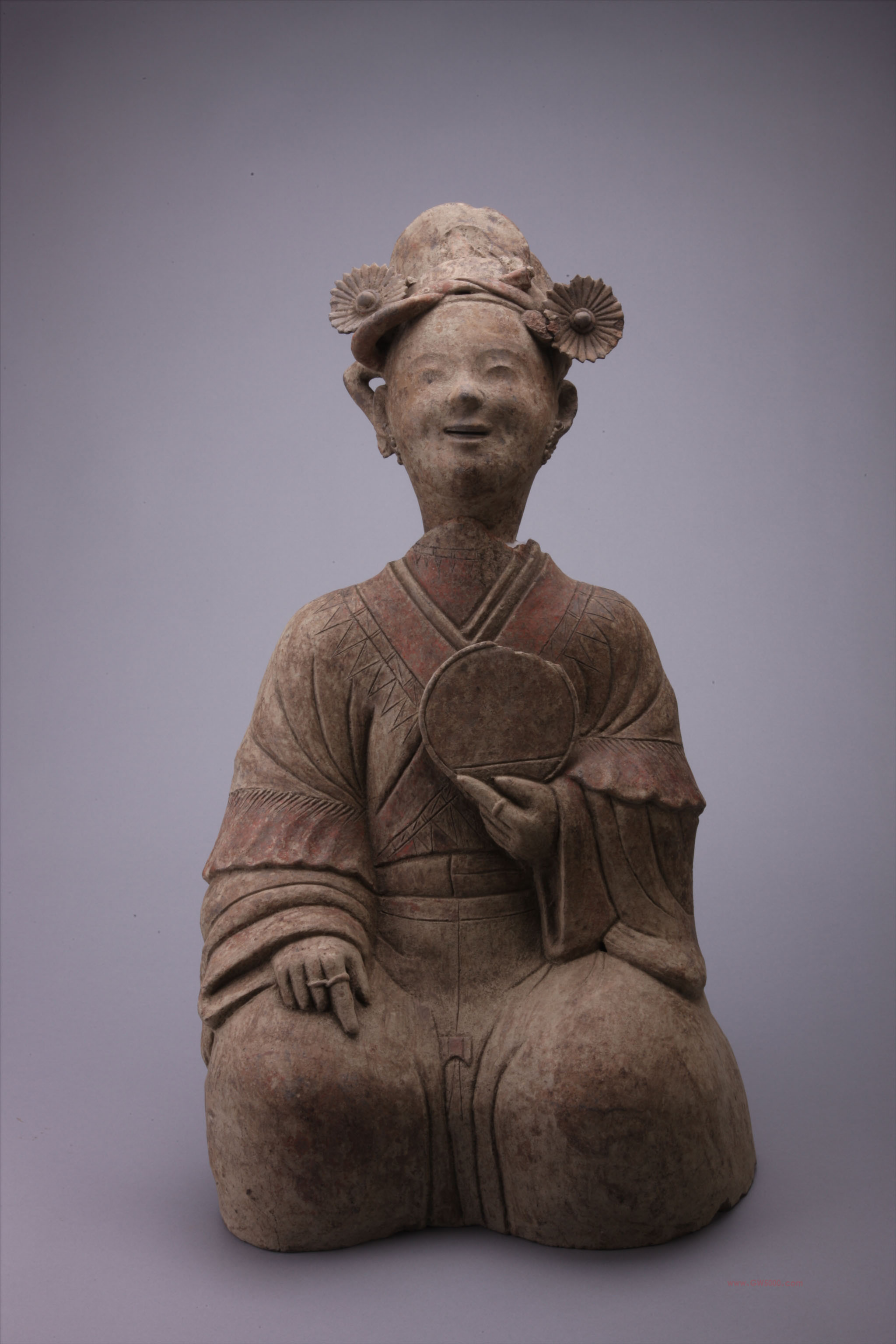 一级文物高61.4厘米成都市郫县宋家林东汉砖墓。泥质黄灰陶俑头与身可分开。发髻上左右各戴一花面带笑容。左手持一扇于胸前右手放于右膝食指与中指带饰着褶领大袖袍袍纹饰清楚袍上着朱红色。