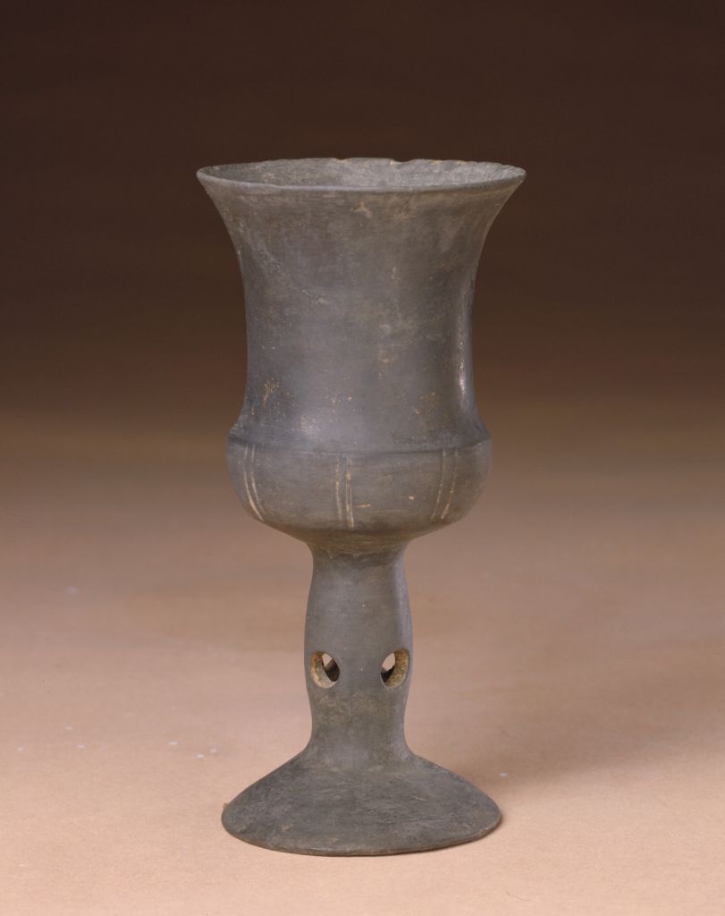 杯敞口,束腰,高柄足外撇,平底。杯身有凸出的弦纹为饰,高柄中空,柄外壁镂三孔。因采用了轮制方法,器壁较薄,素面磨光,配以镂空等多种工艺手法,制作十分考究,是一件精致的饮酒用具,一般在高等级的贵族墓中出土,做礼器。束腰,明清家具部件名称。原是须弥座上枭与下枭之间的部分,在家具上指面框和牙条之间缩进的部。束腰是我国传统家具造型的典型式样之一。古器物上最简单的传统纹饰,在青铜器上呈现为凸起的横线条。大多数情况下,弦纹是作为界栏出现的。在陶瓷等器物上亦有专用弦纹装饰者。
