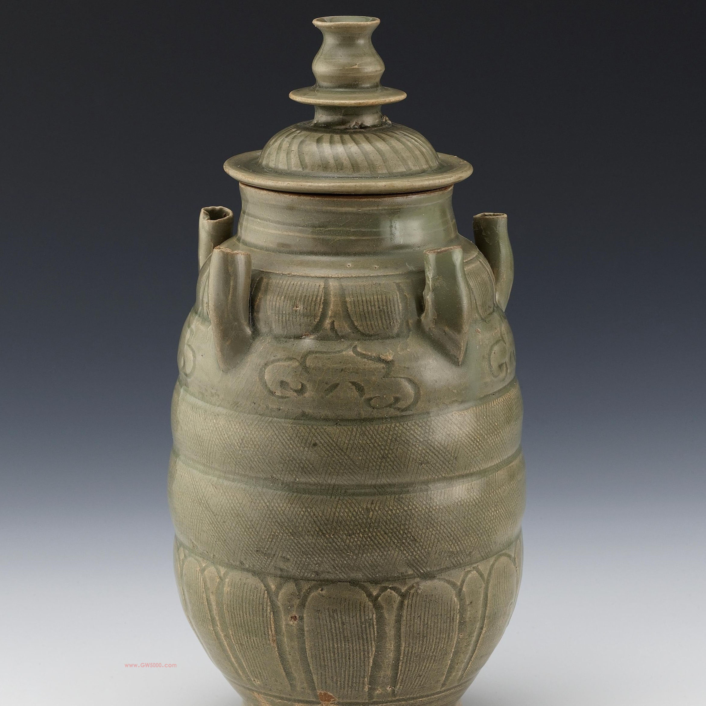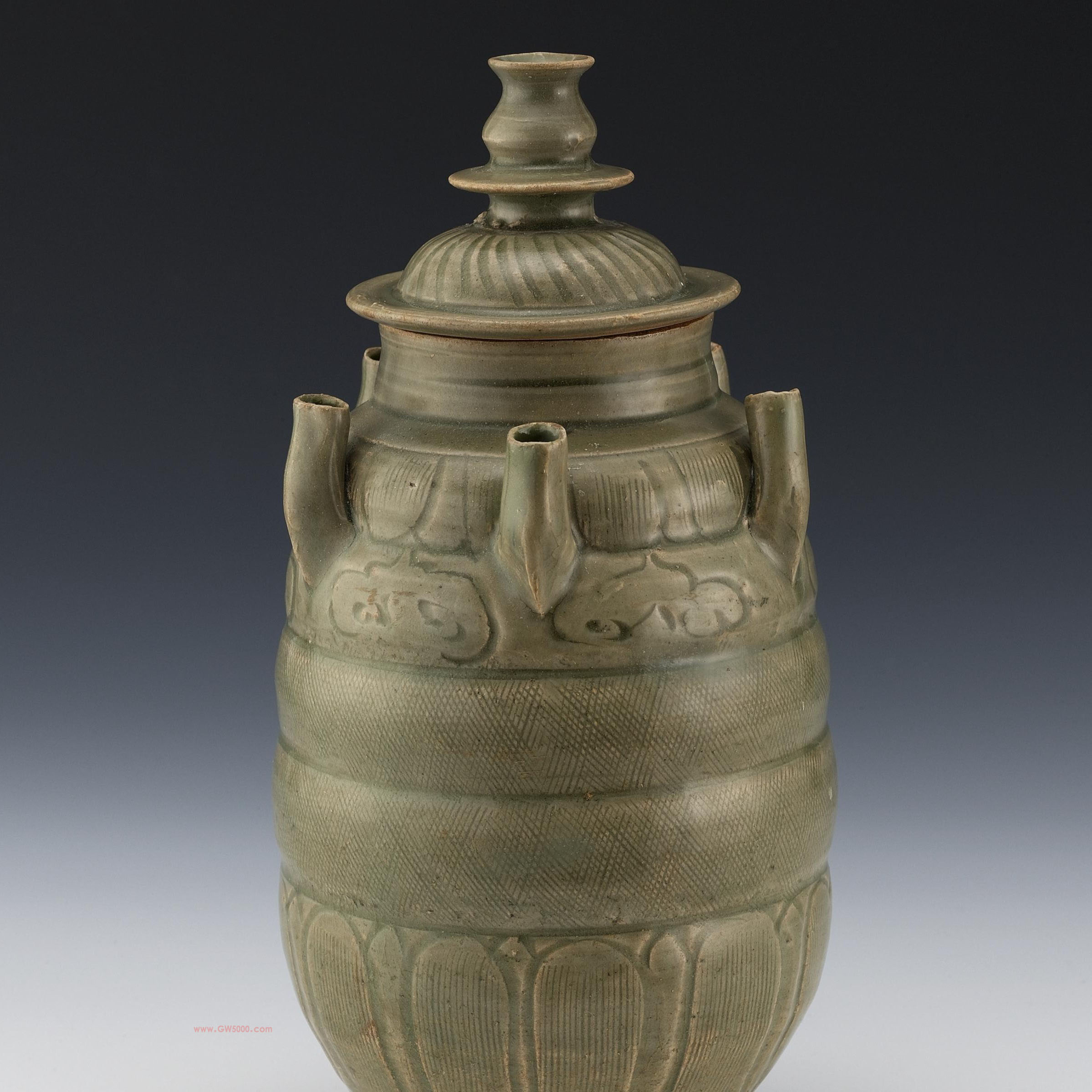 上海博物馆龙泉窑位于今浙江省龙泉县境内,创烧于北宋中期,至南宋而兴盛。其早期作品在器形、釉色、装饰等各方面均与越窑及附近的温州窑、婺州窑相似。如这种五管瓶即是北宋晚期浙江比较常见的器物。龙泉窑器物造型规整,底部修理平滑,器物比较普遍地使用刻花,辅以篦点或篦划纹。云纹、莲瓣纹等都是十分常见的装饰。这件五管盖罐呈多级塔式,肩部和下腹部分别装饰上下相对的莲瓣纹,莲瓣上又饰以篦划纹。两组莲瓣纹之间从上之下刻划如意云纹、压印网格纹,整体和谐而又富于变化。