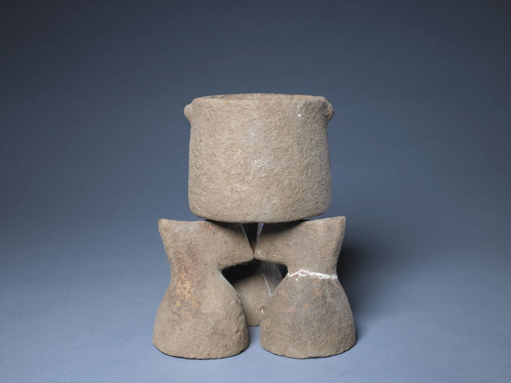 盂(yú 音于),平底,底径略大于口径,口两侧有圆形饰物。夹砂红陶,表面粗糙。支座由三个独立的支架组成,支架上有类似四边形支托,下为圆形圈足。盂可以用来盛放食物与水,当它放到支座上时,就可以被加热。陶土里夹砂能够提高陶器的耐急热、急冷性能。在磁山文化陶器中,支撑炊器的支架颇具特色。