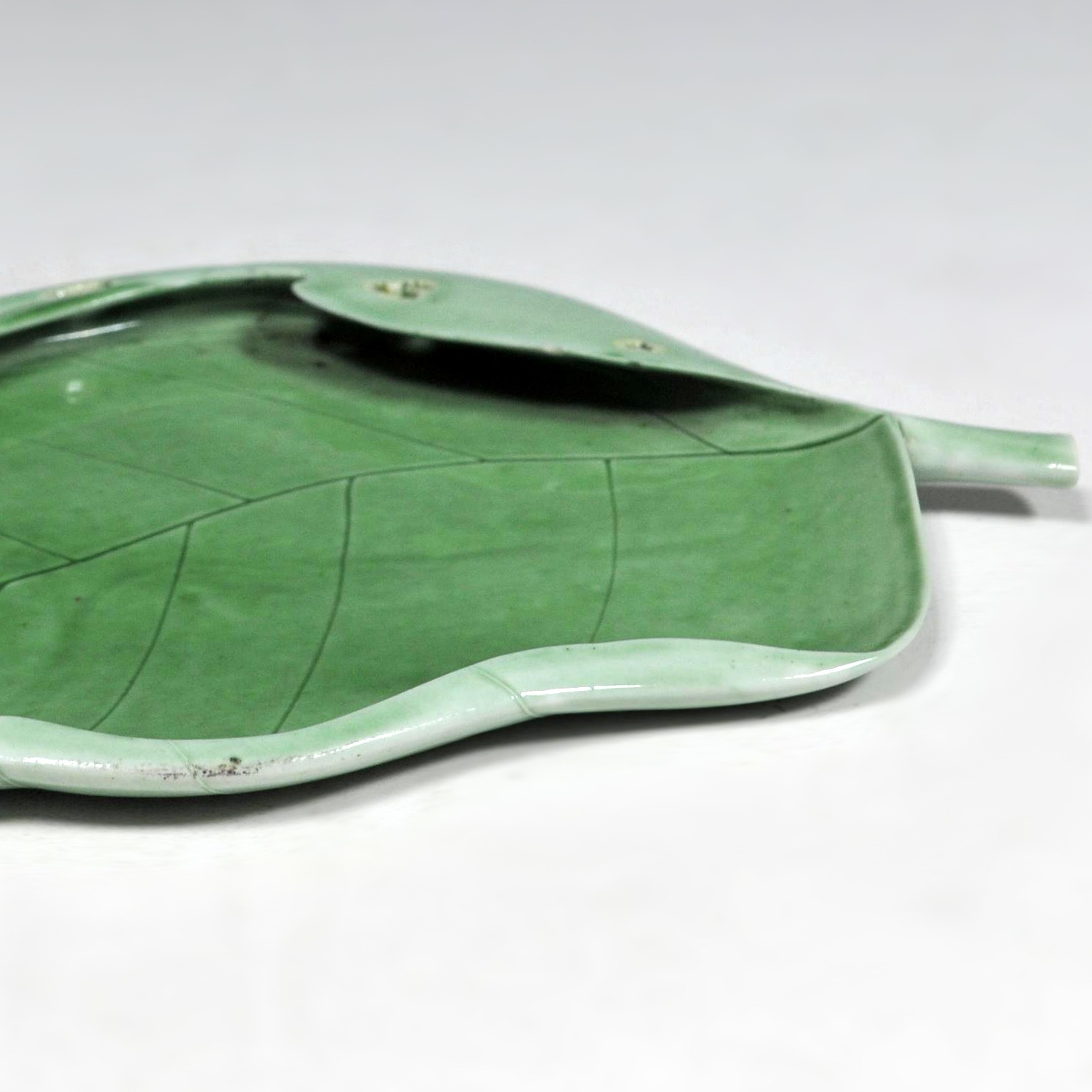 这件秋叶形笔舔是康熙时期的官烧文房用具,造型设计别出心裁,做成一片秋叶的形状,叶面和叶边分别施以两种深浅不同的绿釉,体现出正背之别。叶脉以墨色釉勾勒,卷起的叶边处还特意做出虫蛀的小洞,更显逼真。