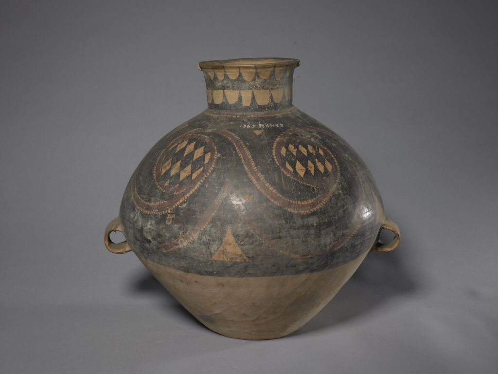 彩陶漩涡菱形几何纹双系壶,新石器时代马家窑文化半山类型,高37.7厘米,口径13.8厘米,底径14厘米。