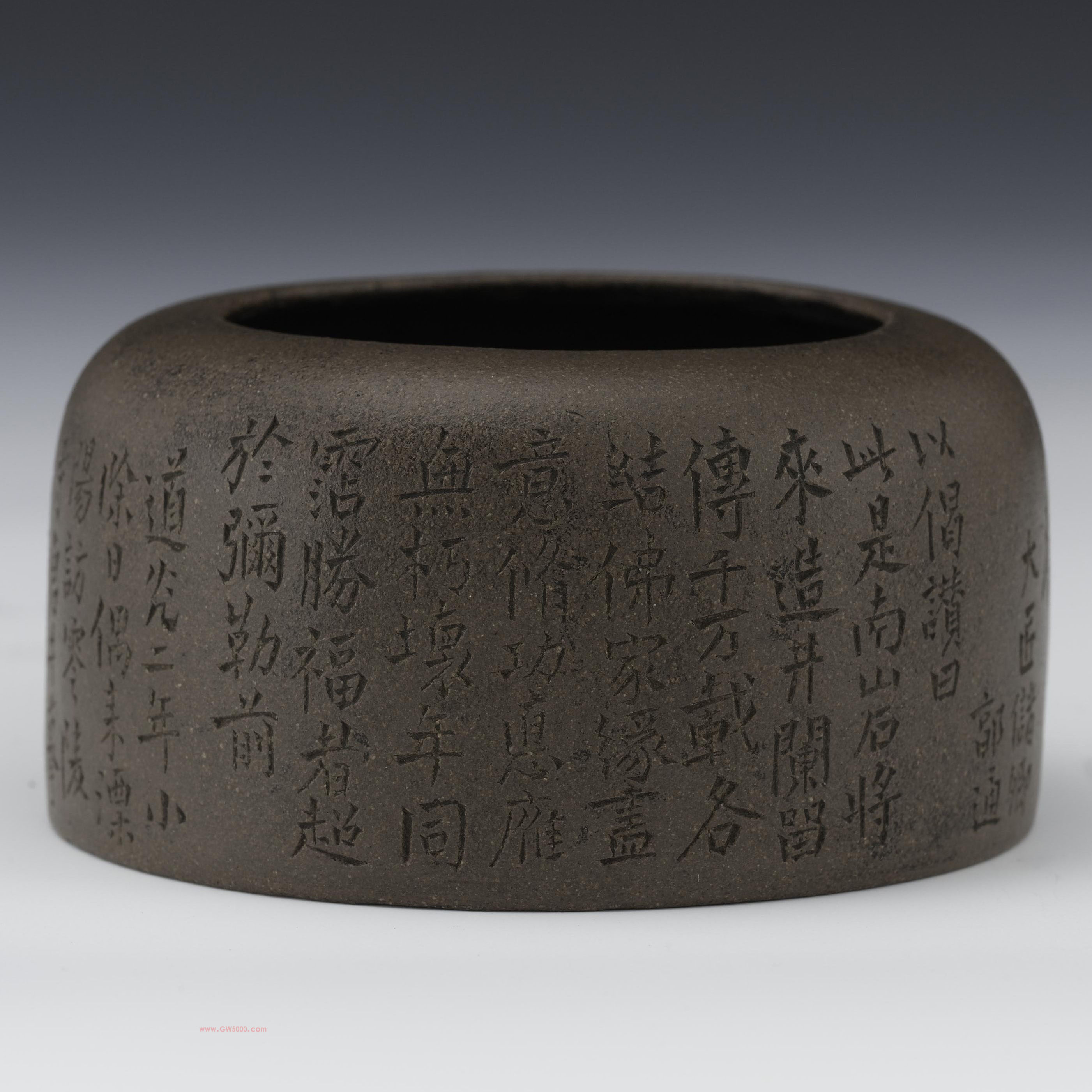 水盂是文房的常见用具。这件水盂器型浑朴,炼泥细腻,朴而不拙,气息古雅。器底篆“杨彭年造”方印,器身有清人杨秉桂长铭自叙道光二年在溧阳零陵寺见唐井栏铭而制此水盂,并摹写井栏铭。