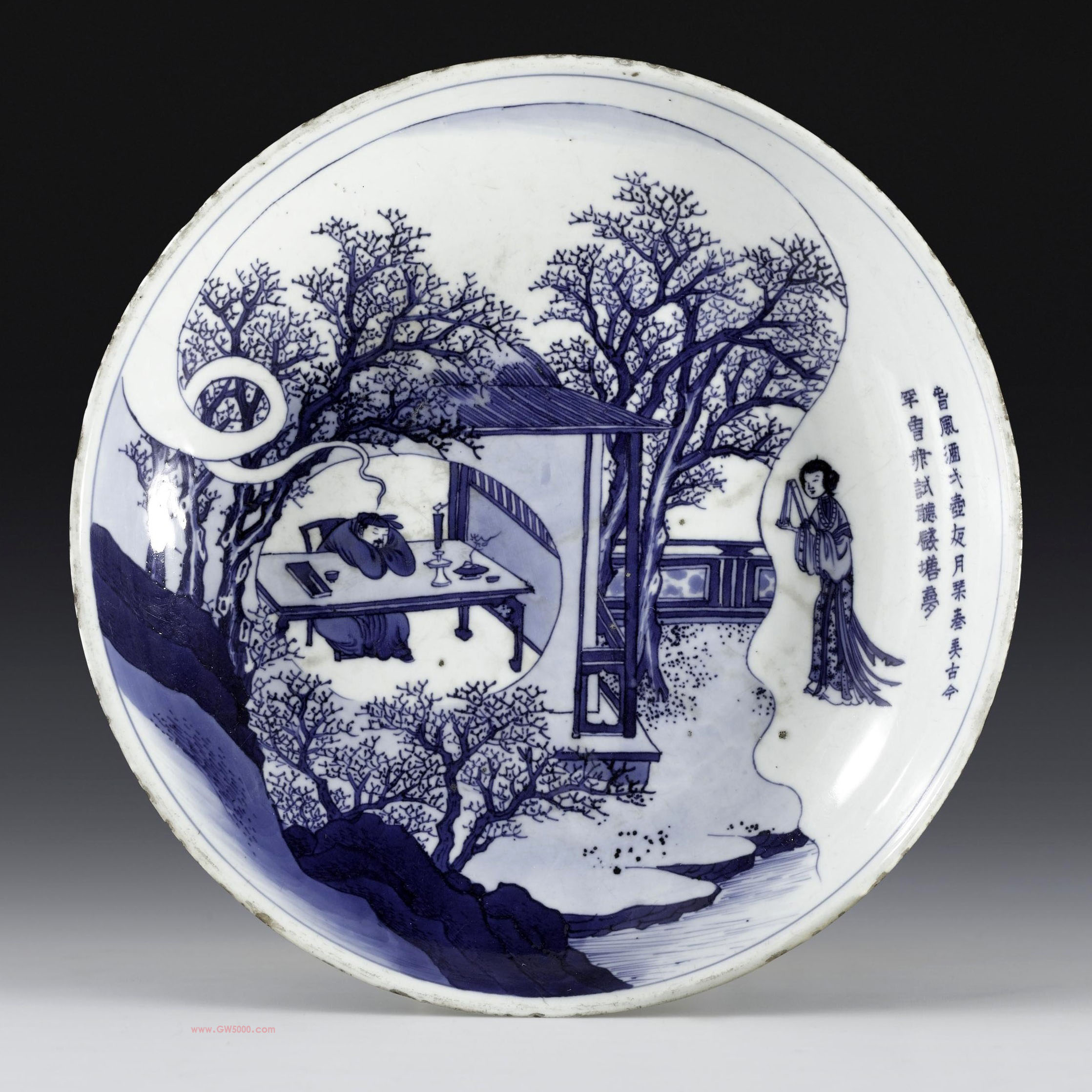 该盘纹饰表现的是苏小小和司马仲才之间的爱情传奇故事。画面中有一带月洞门和回廊的卷棚顶建筑,四周古木参天,山石奇峻。前方湖泊荡漾,后有拦板围绕。屋内一男子坐在椅子上正伏案酣睡。画面右侧一弱小女子正手持响板而歌:"春风酒一壶,夜月琴三弄。古今罕曾无,试听钱塘梦。"司马仲才为北宋文人,曾夜梦南齐名妓苏小小。后至杭州谒苏小小墓,又梦与小小相会。仲才死后,葬于苏小小墓旁。这一故事出于宋话本, 元白仁甫有《钱塘梦》杂剧,明沈冰有《芳情院》传奇,为明代瓷器装饰流行题材。