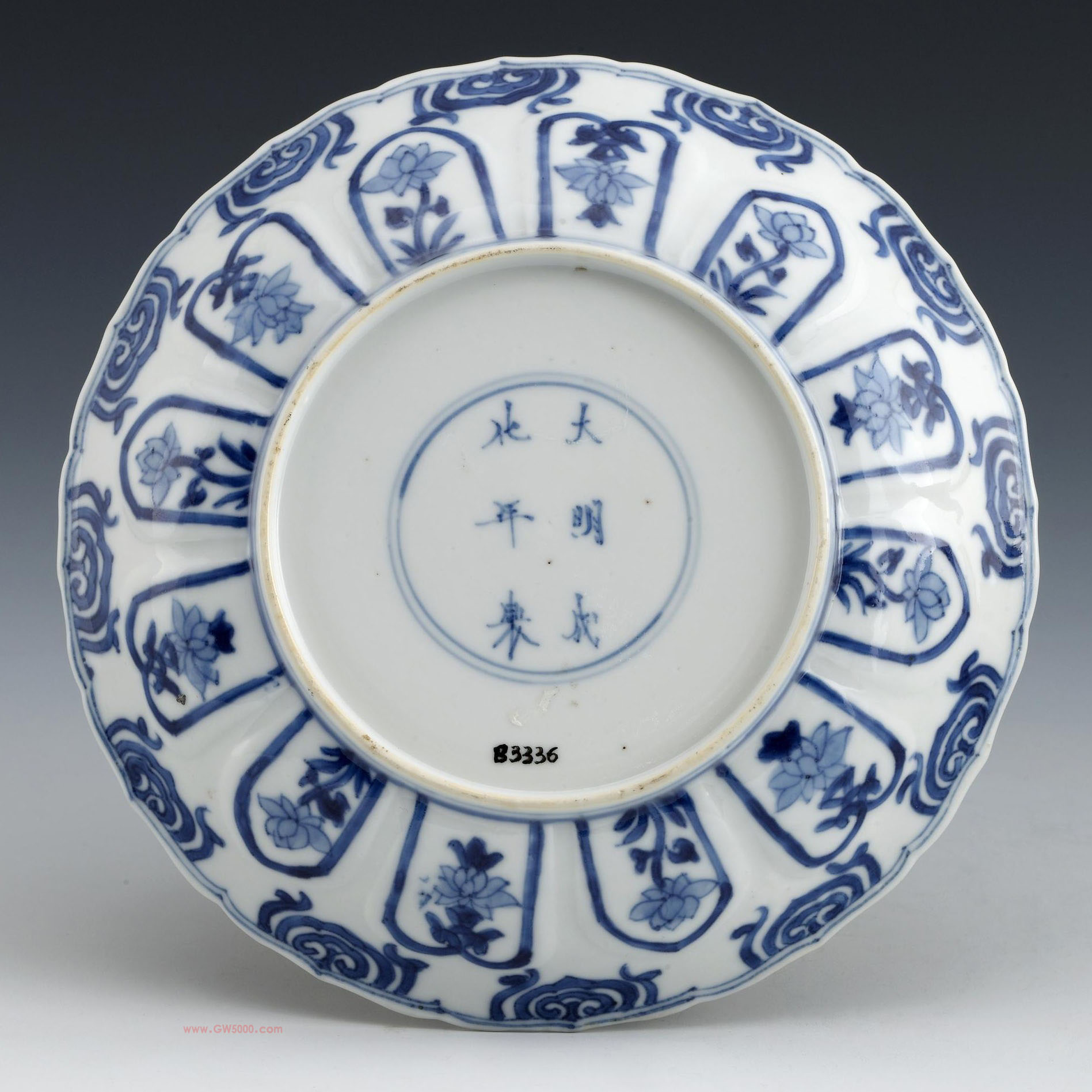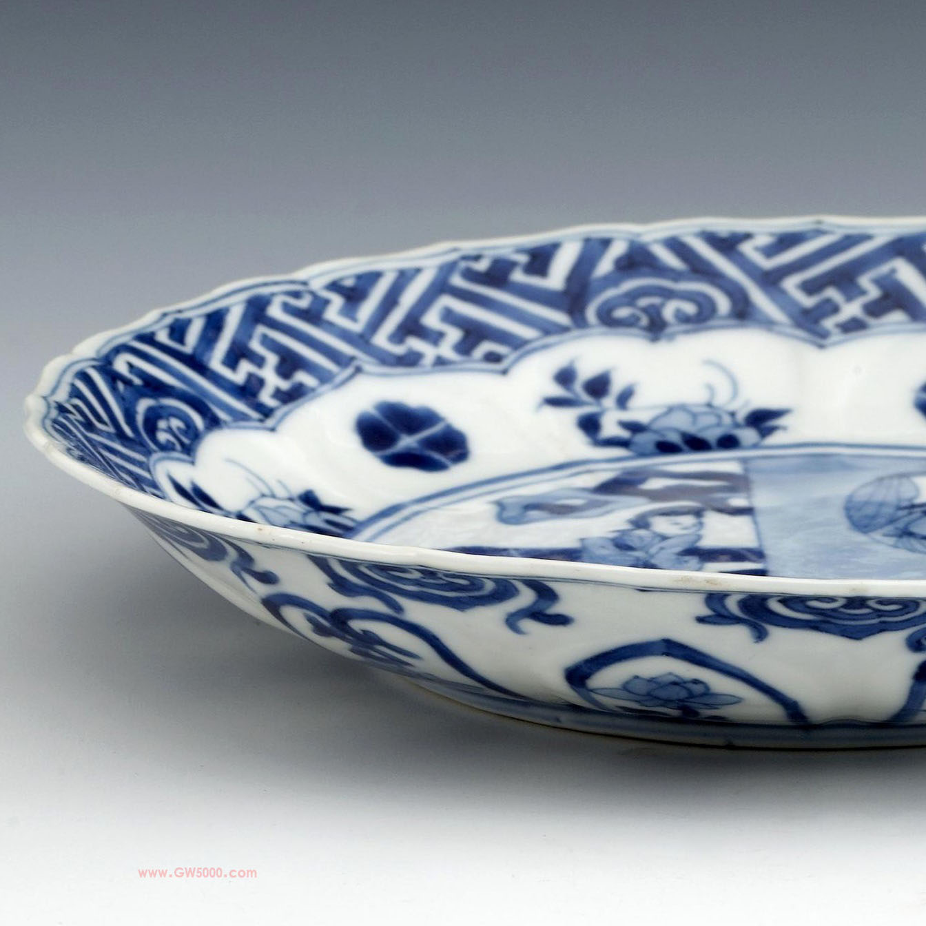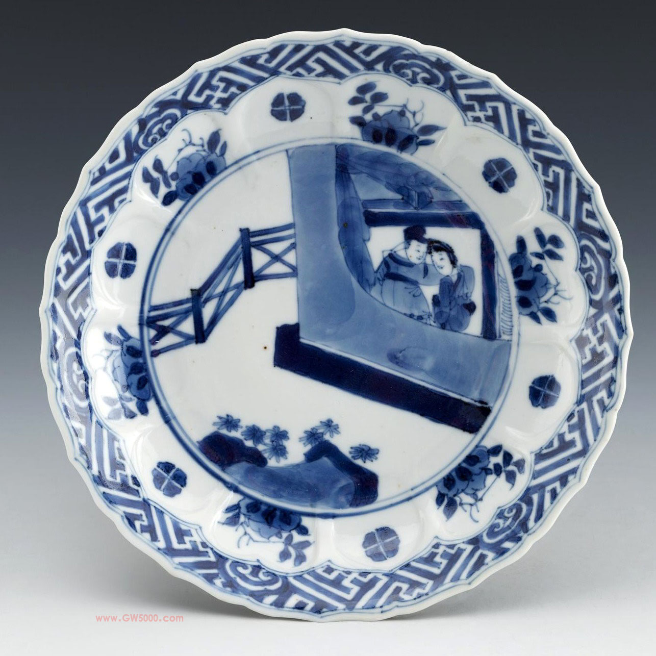 这套花口盘是上海博物馆2008年8月接收荷兰Mr.H.B.Nieuwenhuys的捐赠,当是明清时期批量外销瓷器中的产品。盘心青花绘《西厢记》故事, 画面略有不同,两盘为张生、莺莺二人在西厢密语,另一盘有红娘在窗外独立等候,表现的正是《佳期》一折中的场景。