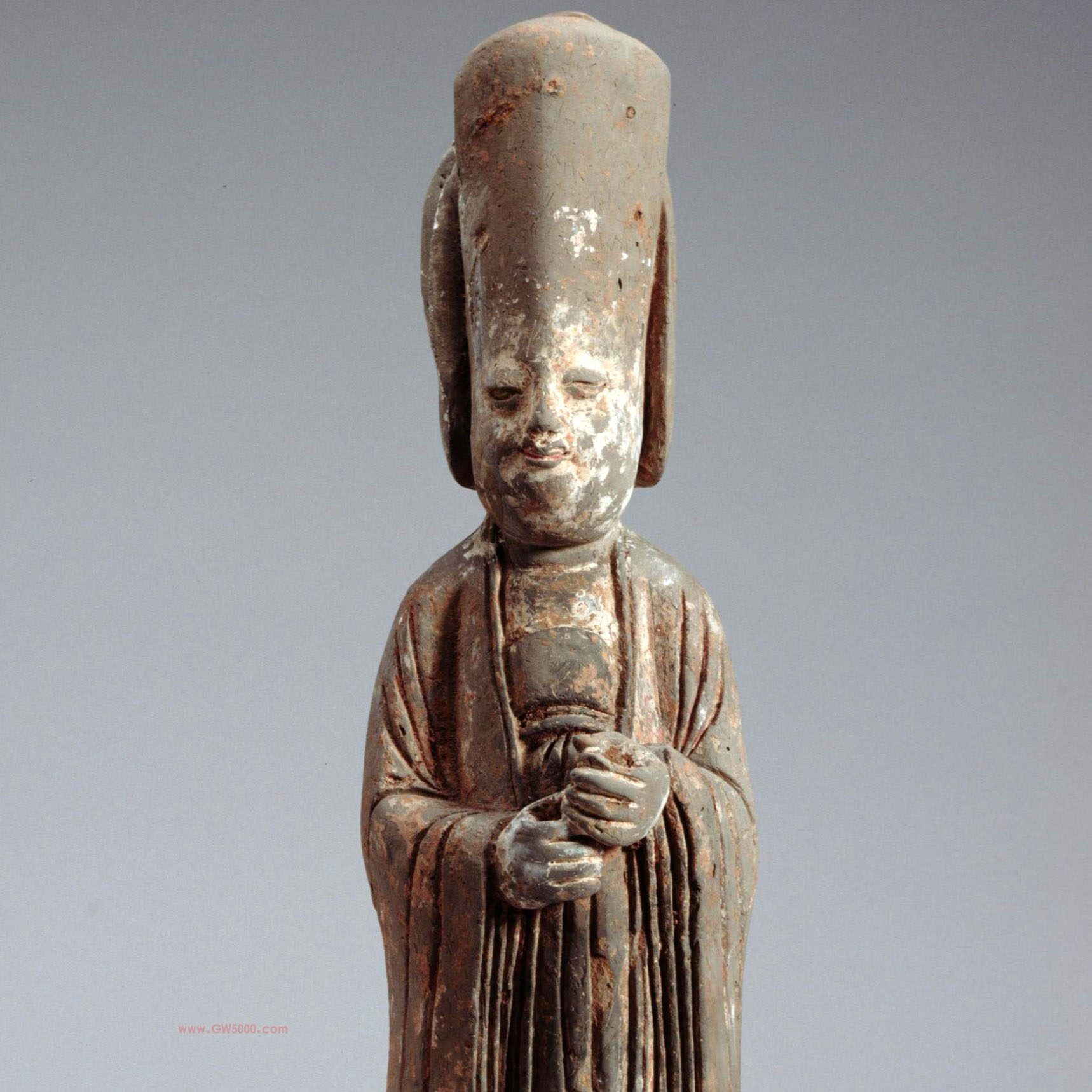 上海博物馆两件陶俑均为泥质灰陶,表面彩绘脱落。李昪陵共出土男、女陶俑136件,是随葬品中数量最多的一类。陶俑皆用黏土制成,泥质较细,表面为灰色,有大、中、小三种尺寸。依据人物姿态,可分为拱立俑、持物俑和舞蹈俑。陶俑服饰繁复,仅男俑就有六种帽式,四种服饰和鞋子。女俑发髻部位留有数个小孔,有锈蚀的金属物附着残留,可知当时用了其他配件装饰。唐、五代时期的女子发型,根据文字记录有十几种之多,如云髻、同心髻、螺髻、双环望仙髻、鸾凤髻、抛家髻等。近年来,从这时期墓葬中出土的不少发髻上的金银配饰,可与文献相互印证。