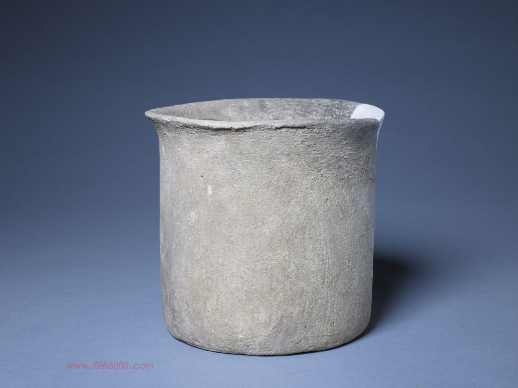 盂(yú 音于),撇口,圆筒形腹,平底。夹砂红陶,胎壁较厚,表面粗糙。 磁山文化因最初于1972年发现于河北省武安县磁山村而得名。据科学测试,其年代约为公元前6000—前5600年,属于华北地区新石器时代中期文化遗存。盂是一种盛汤浆或饭食的器皿,红陶夹砂能够提高陶器的耐热程度,因此这件红陶盂可能是一件炊器。磁山文化属于新石器时代中期文化遗存。因首先于1972年在河北省武安县(1988年撤县建市)磁山村被发现而得名。遗址总面积约14万平方米。1976年~1978年对部分区域进行了科学考古发掘,发掘面积6000平方米,出土陶器、石器、骨角器、蚌器、动物骨骸、植物标本等遗物6000余件。其中陶盂及陶支架、石磨盘及磨棒堪称磁山文化最具代表性的器物。据碳14法测定年代,距今约8000年至前7600年,与1977年在河南省新郑县裴李岗村发现的裴李岗文化的年代大体相当。磁山文化的陶器均为手工制作,用泥条盘筑法和捏塑法成型,绝大部分属于夹砂红褐陶,少部分为泥质红陶,以素面为主,烧成温度在700~930℃左右。