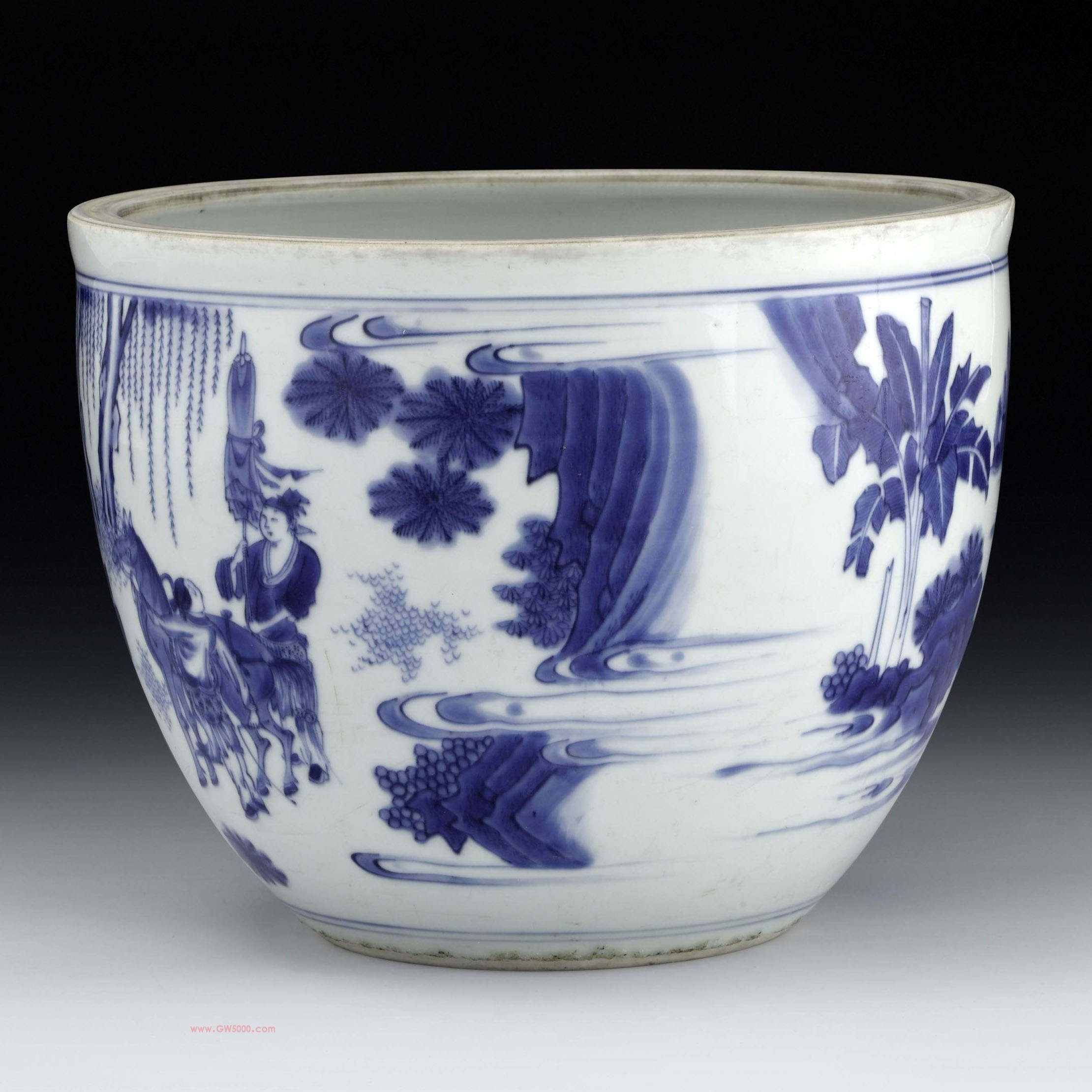 茶缸上以深浅不一的青花描绘出山野景象,一位农人牵牛而立,正向对面的邴吉回答问题。邴吉身着官袍而立,身后是执伞、打扇的仪仗及捧物、牵马的一众随从,或恭谨而立,或交头接耳,神态生动。