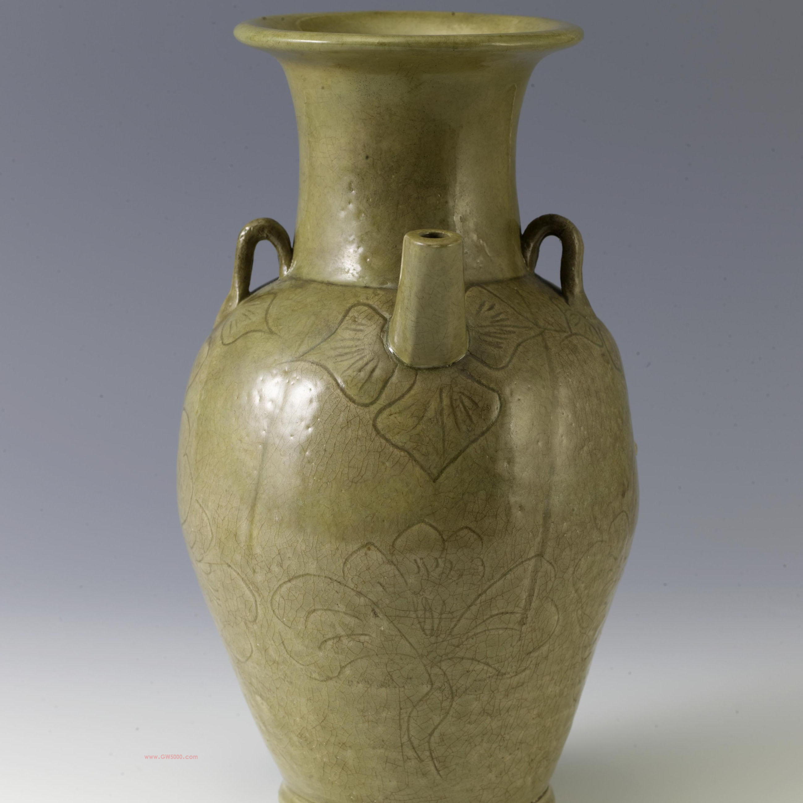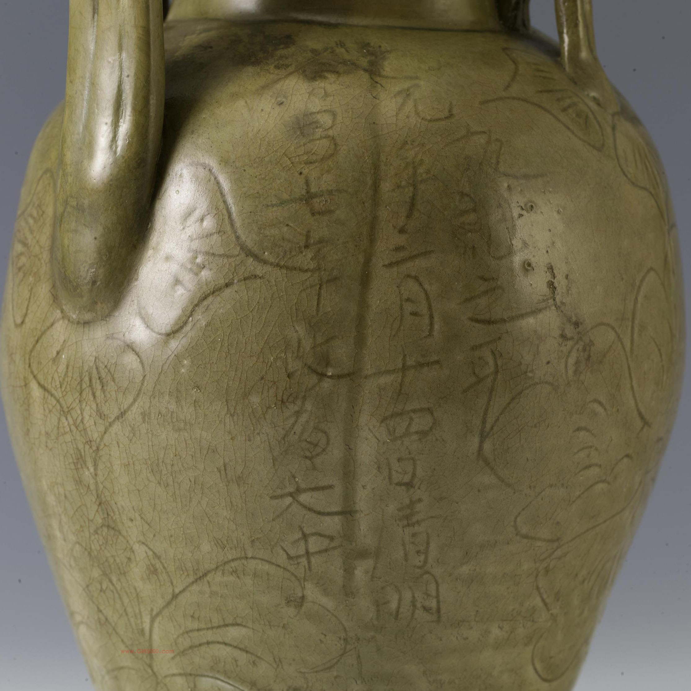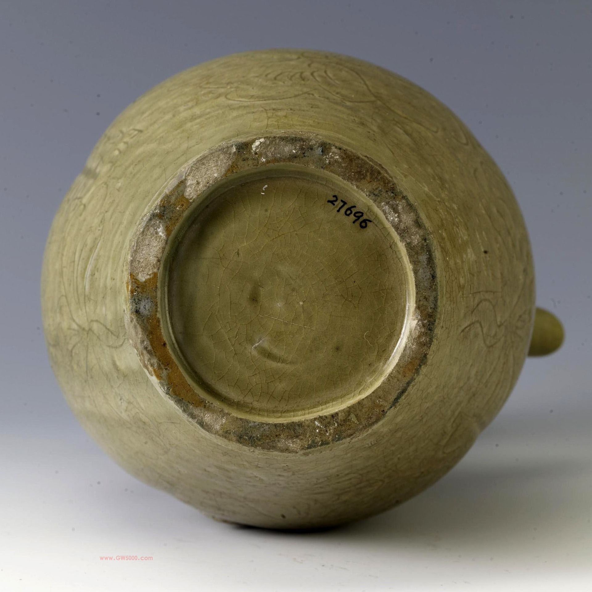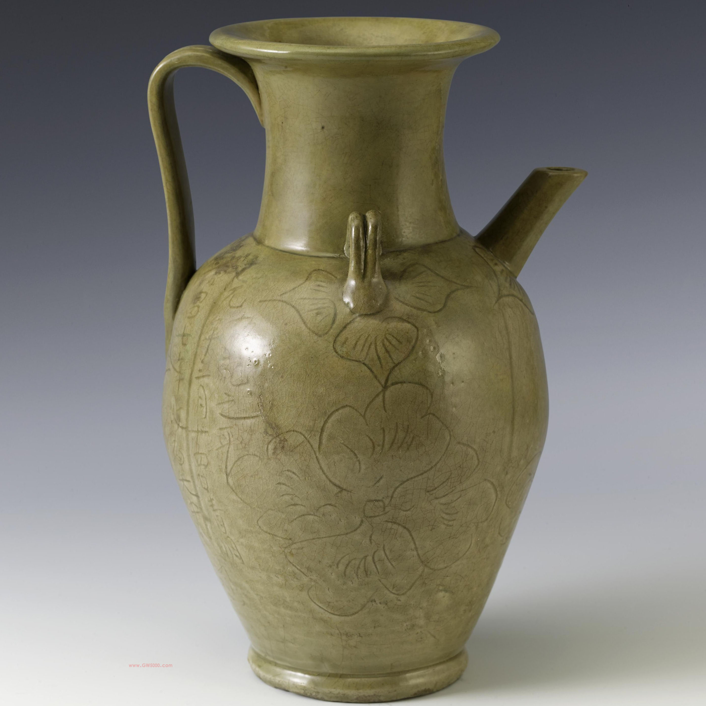 这件越窑执壶器形修长秀丽,釉色均匀润泽,肩部设双系,器身浅划花卉纹,线条流畅自如,是一件不可多得的精品。最为难得的是,壶身刻有“会昌七年改为大中元年三月十四日清明故记之耳”铭文,明确表明了此壶的制作年代,是唐代越窑执壶的标准器。