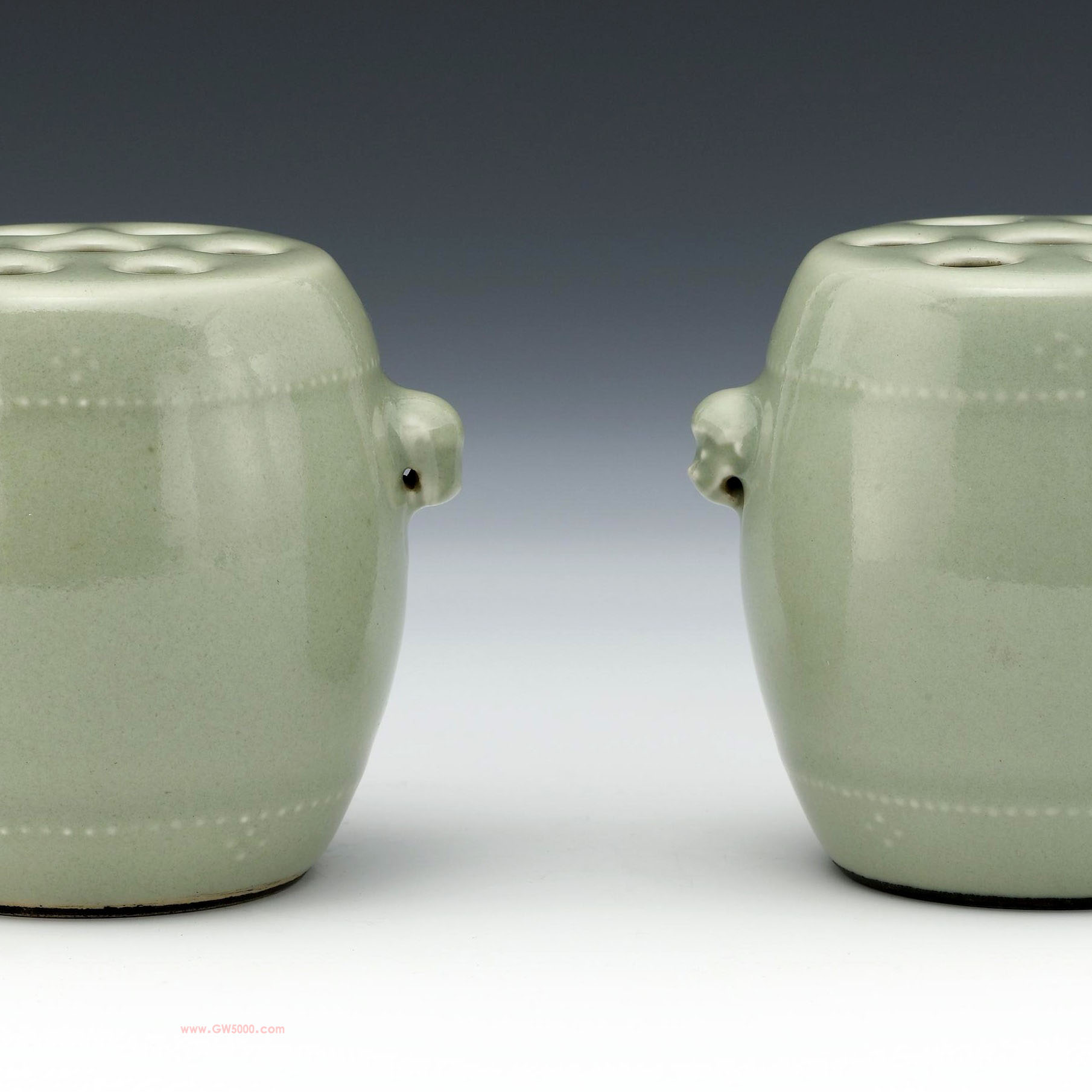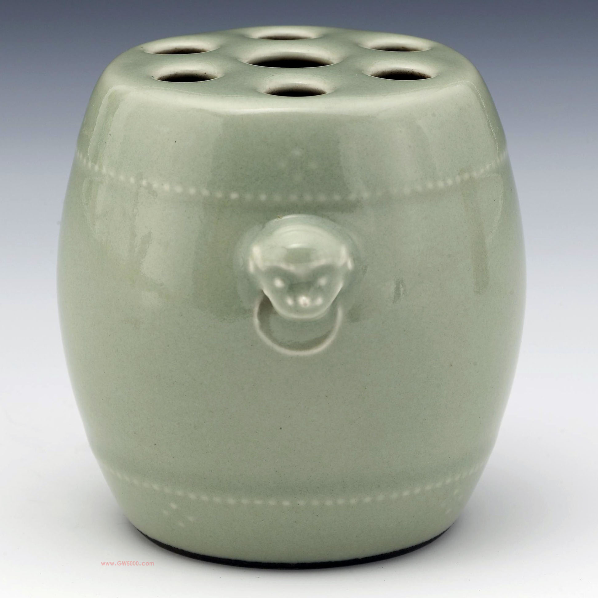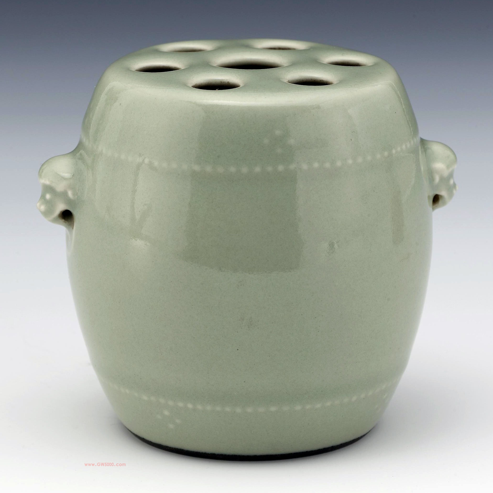 这件鼓式器釉质坚硬,釉面莹润,具有如玉般的视觉效果。鼓面上有七个圆形插孔,专为插花而设。花插尺寸较小,当为案头插花专用。