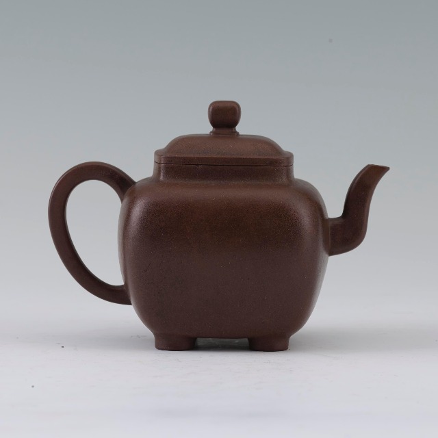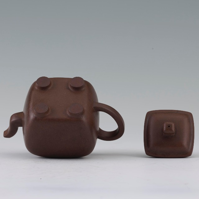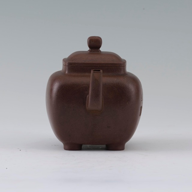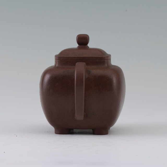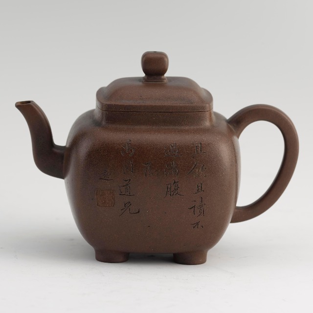 这件执壶作方形,下接四短足,造型简朴,比例优美,流、把、壶身虽均为方形,但边缘打磨浑圆,朴而不拙。壶身题刻“且饮且读不过满腹 为禹道光兄 远”并镌“陈鸣远”方形印。