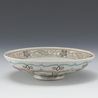 卵白釉器多见盘、碗、高足碗等小件器皿,装饰以印花为主,还常常印有“枢府”字样。这件梵文盘印花卉纹、八吉祥纹,并加以金、蓝、褐色的彩绘且保存完好,十分珍贵罕见。