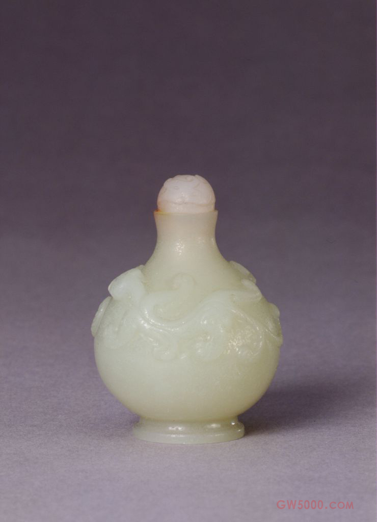 青玉凸雕双螭烟壶,清乾隆,通高5厘米,腹径4厘米。