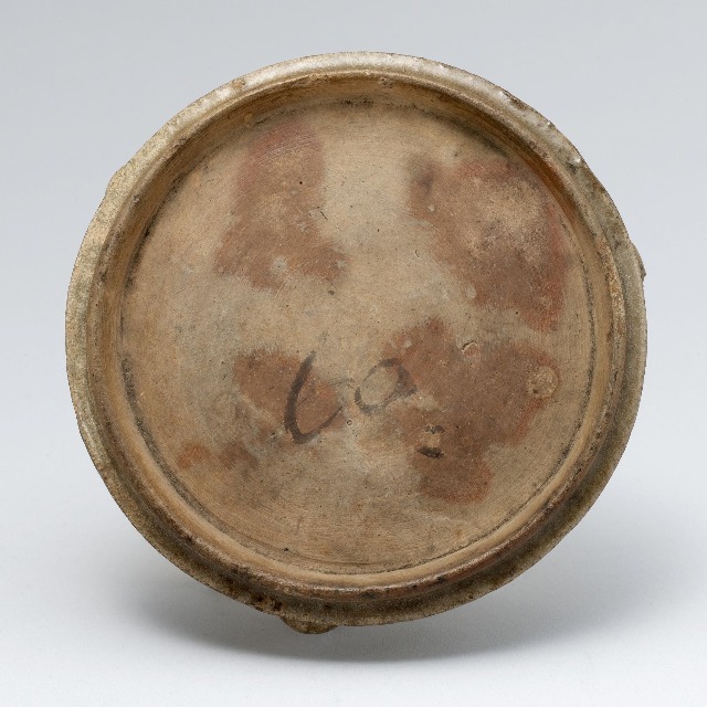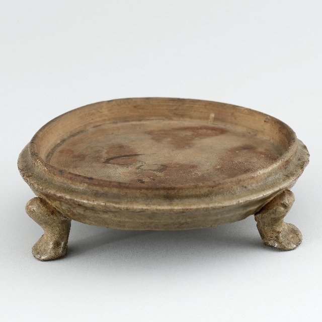 三足圆形砚出现于东汉时期,是在圆饼形砚的基础上发展而来,材质以石和陶为主,多带高浮雕动物盖。随着两晋时期中国南方地区瓷业的快速发展,南方地区尤其是江南一带出现了大量的瓷质三足圆形砚,多见熊足、兽面足、力士足等,砚面多平坦或略微凸起。至南北朝时期,瓷质圆形砚台的足部数量逐渐增多,砚面大多中央突起,周沿形成凹槽,对以后辟雍砚的形成产生了深远的影响。