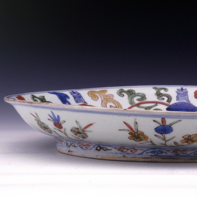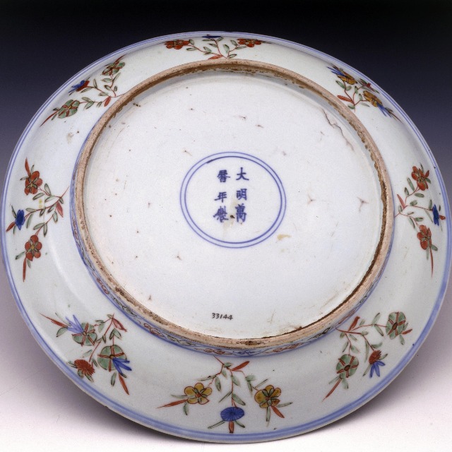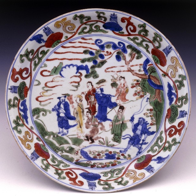 上海博物馆撇口,浅弧腹,圈足。通体彩绘装饰,色泽鲜艳,对比强烈,外底青花双圈内书写“大明万历年制”双行六字楷书款。盘心用釉下青花及釉上五彩绘制八仙人物,人物造型各异,神态生动,各持法宝,面朝海浪,立于树石旁边,同时以大片云纹为背景。