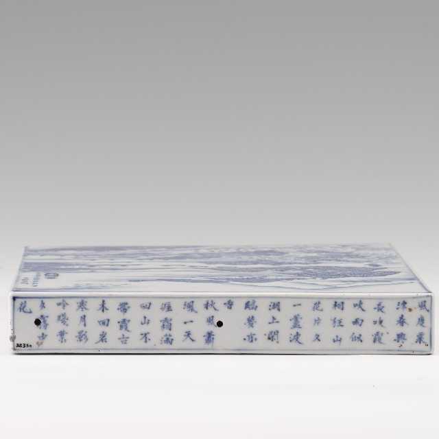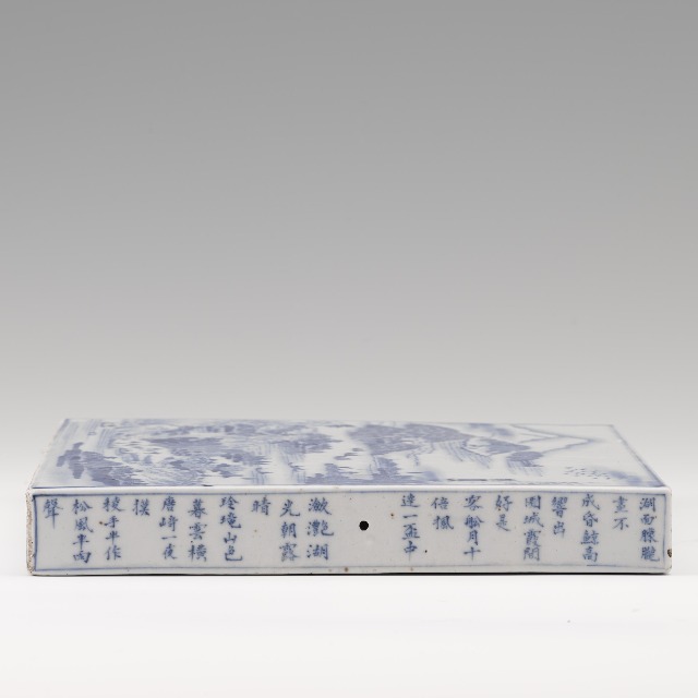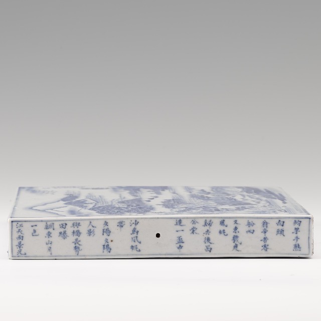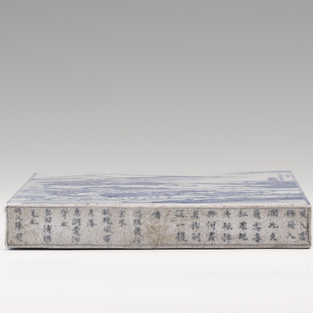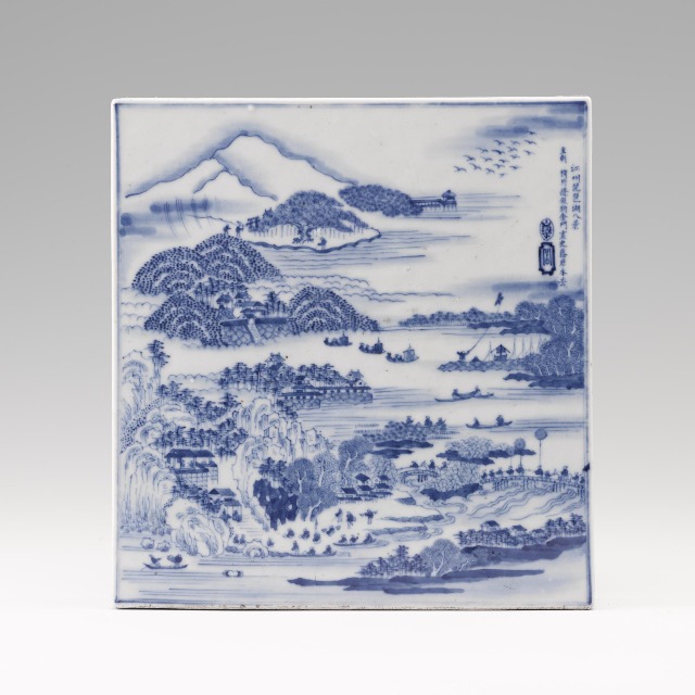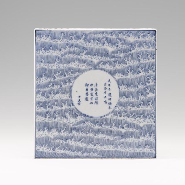 上海博物馆瓷板方形中空,正面绘日本江州琵琶湖八景图,远山近林,烟波浩渺,署名皇朝狩野缝殿助金门画史藤原永岳绘,背面饰波涛纹,中间圆形开光内书“大日本摄州桥本景留居士嘱,清嘉庆昭阳作噩岁宦工陶贞恭制十五枚”,侧面书咏景七言诗八首。《尔雅》“太岁在癸曰昭阳”“太岁在酉曰作噩”,嘉庆十八年癸酉,即1813年。目前在日本有数件类似瓷板传世。