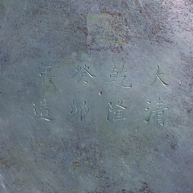 由于瓶内里与圈足内底均施淡绿釉,故此件作品的烧造工艺较为复杂,需先在1200℃以上的高温窑炉中烧成内透明釉外蓝釉器,然后再在器内与圈足内底施淡绿釉,于低温窑炉中二次烧成,再用金银彩绘纹于彩炉中三次烧成。难能可贵的是,此瓶进贡朝廷后即在内务府造办处配得银器座,座底有“大清乾隆癸卯年造”楷书款,乾隆癸卯年即乾隆四十八年(1783年)。