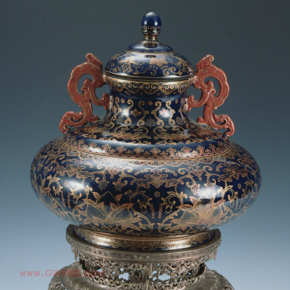 上海博物馆钮盖高耸,敞口,束颈,器腹扁圆,圈足。古朴端庄的形制在卷曲灵动的夔龙耳衬托下显得尤为凝重雅致。通体施高温蓝釉,在其上用金彩、银彩描绘纹饰,工整华丽,底有青花书写“大清乾隆年制”三行六字篆书款,这种在一件器皿上同时采用金银彩描绘纹饰的制品较为少见。