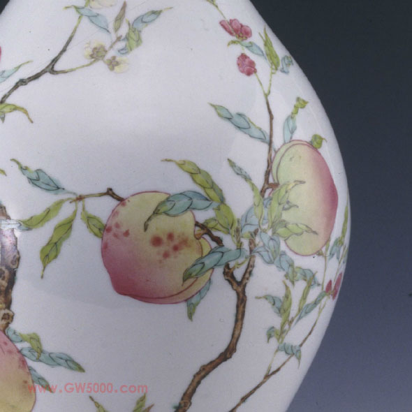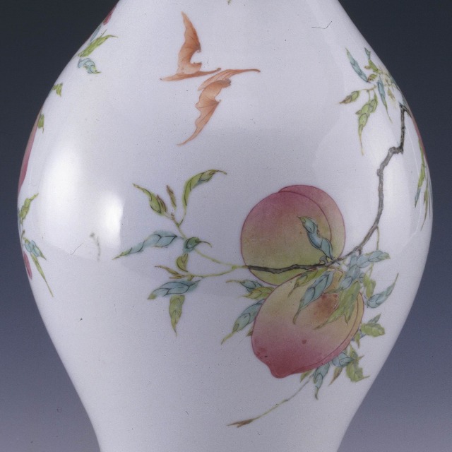 上海博物馆侈口,细颈,溜肩,鼓腹,胫部内收,底部略外撇,形同橄榄,端庄秀美。胎质细腻,釉色莹润,制作极为精良。瓶底有青花“大清雍正年制”两行六字双圈楷书款。白净的外壁以粉彩绘桃枝一双,遒劲盘亘,有力地向四周伸张。枝上绘寿桃八只,圆润饱满,色彩过渡自然,极为可爱。枝梢点缀桃花,花蕾含苞。桃叶施绿彩,正反阴阳,一浅一深,节奏鲜明。桃枝之间绘一对飞舞的蝙蝠。这种将蝙蝠与寿桃相结合的装饰图案在清代极为流行,取“福寿双全”之寓意。粉彩创烧于清代康熙晚期,是在五彩的基础上发展而来的。因为所用彩料多为西方传入,所以又被称为“洋彩”。其制作工序是在高温烧成后的白瓷上,以珠明料(黑色)和西赤(红色)勾勒出纹饰轮廓,然后在轮廓内以含砷的“玻璃白”打底,再将彩料施于玻璃白之上,经过填、洗、扒、点等技法,将颜色依深浅的不同需要晕开,最后经700℃左右的低温焙烧而成。由于砷的乳浊作用,当它与各种彩料相融合后,便产生粉化作用,使之出现浓淡深浅的层次变化,给人一种粉润柔和之感。